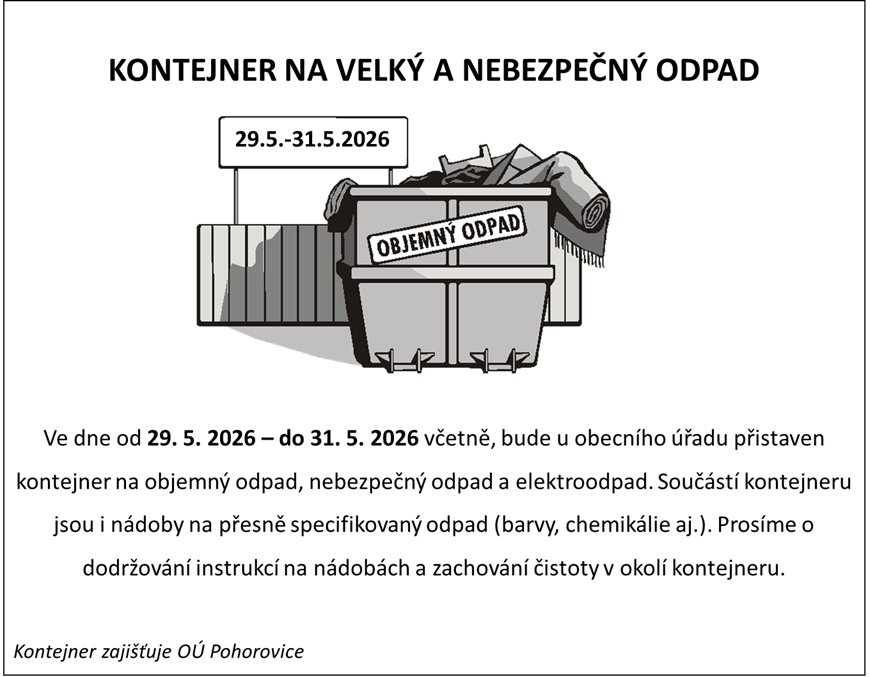 Ve dnech 29.5.2026-31.5.2026 bude u OÚ přistaven kontejner. Podrobnější informace na letáčku.